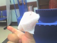 Dari mula sampai habis , dia punya nangis dan bila last sekali nak balut jarinya tu, dia blh cakap sambil teresak2 nangis; "Orang tak naklah jari ni. Buangkan je". Nak tergelak SheiLa dan Mr SH mendengarnya.